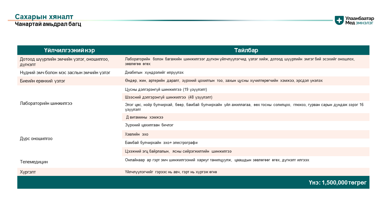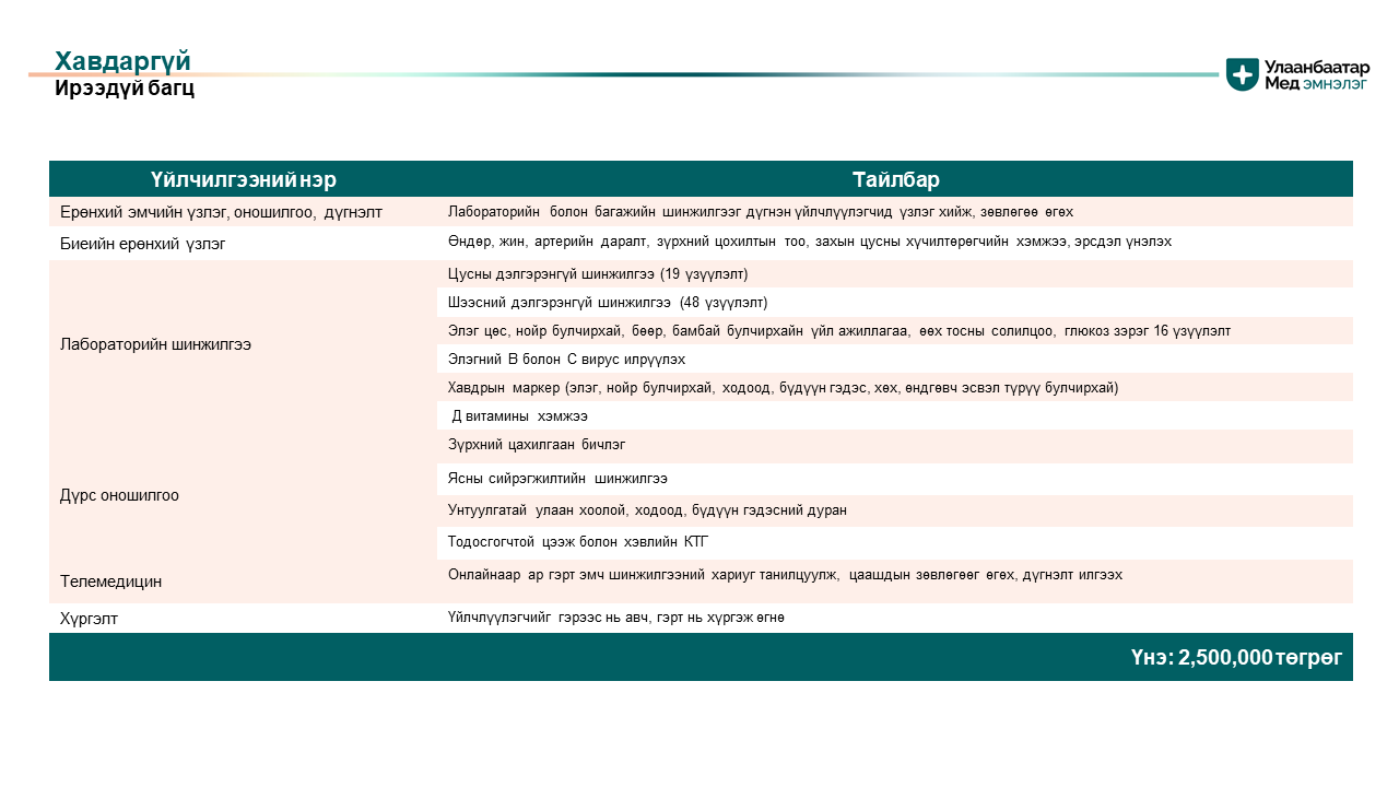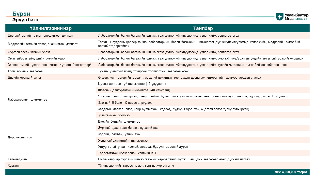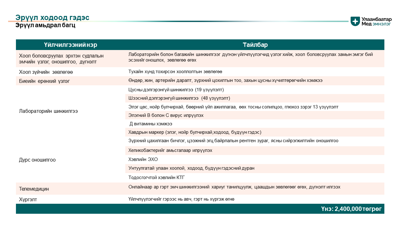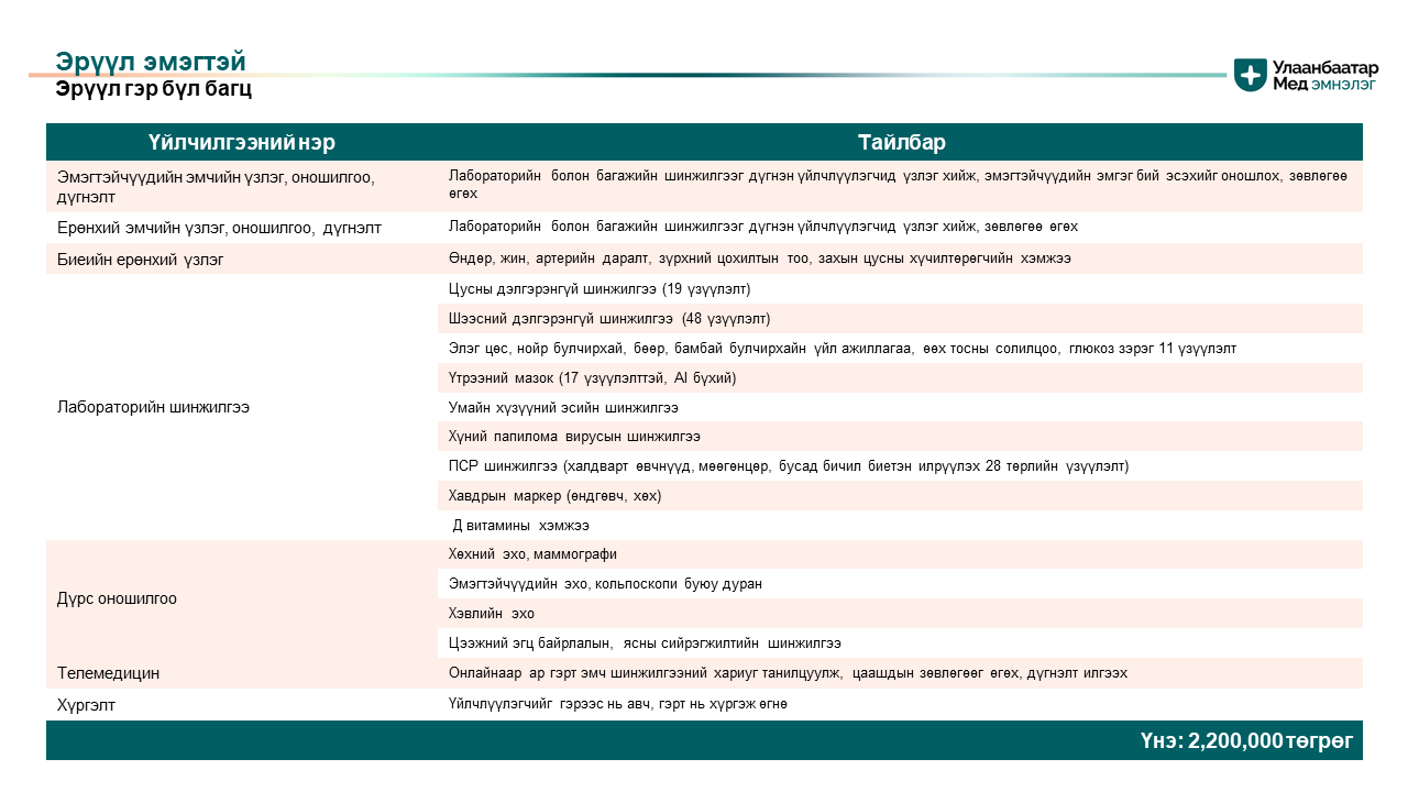 Монгол дахь ар гэрийнхэндээ зориулсан эрүүл мэндийн иж бүрэн үзлэгийн 6 багцыг Улаанбаатар Мед эмнэлэг танилцуулж байна.